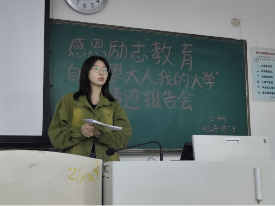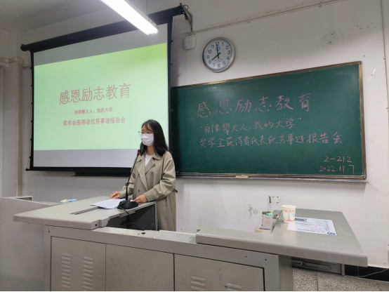 唐丽提出“凡事感恩,学会感恩”的观点,表明自己对于获得国家奖学金身怀一颗感恩之心,并且向同学分享自己的学习经历以及校园生活。潘雪建议同学们积极争取通过大学英语四六级考试,同时德智体美劳全面发展。王梦倚以亲身经历讲述了自己进校后在思想上的变化和行动上的努力,着重强调了奋斗,表示荣誉和掌声属于过去,奋斗才是进行时,鼓励在座的同学要自律奋进。邱雪莲鼓励同学们要积极主动参加班级活动以及各种学科竞赛来锻炼、提升自己,积累实践经验。王林分享了自己的学习经验——持之以恒,并鼓励各位同学常怀感恩之心多参加志愿活动,在提升自己能力的同时培养自己的责任心。