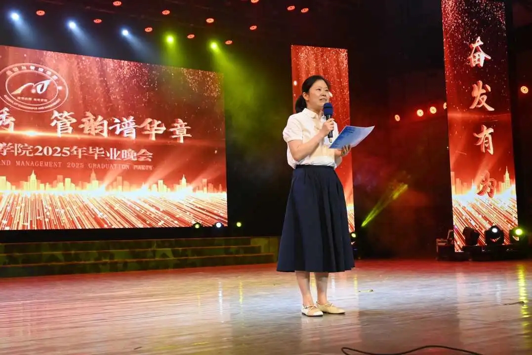 晚会伊始,朱艳发表致辞。她向2025届毕业生顺利毕业表示祝贺,回顾大学时光,毕业是青春旅程的句号,更是人生新篇的起点。寄语毕业生把握时代机遇,将专业知识融入实践,以“初生牛犊不怕虎”的冲劲在岗位践行担当,争做各领域的“六边形战士” 。与此同时,朱艳还送上四句箴言:以平常心做平常人,以包容心做社会人,以快乐心做学习人,以责任心做职业人,并衷心祝愿同学们毕业快乐,前程似锦。