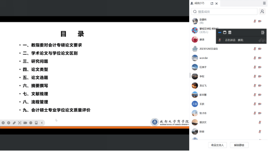 此次讲座为公司MPAcc导师们提供了宝贵的指导,帮助大家更加清晰地理解MPAcc学位论文的要求与写作要点,也为进一步提高会计硕士学位论文的整体质量奠定了基础。通过这次专题讲座,公司师生们对MPAcc学位论文的选题与写作过程有了更深入的理解,为今后更好地指导员工完成学位论文提供了有力支持。