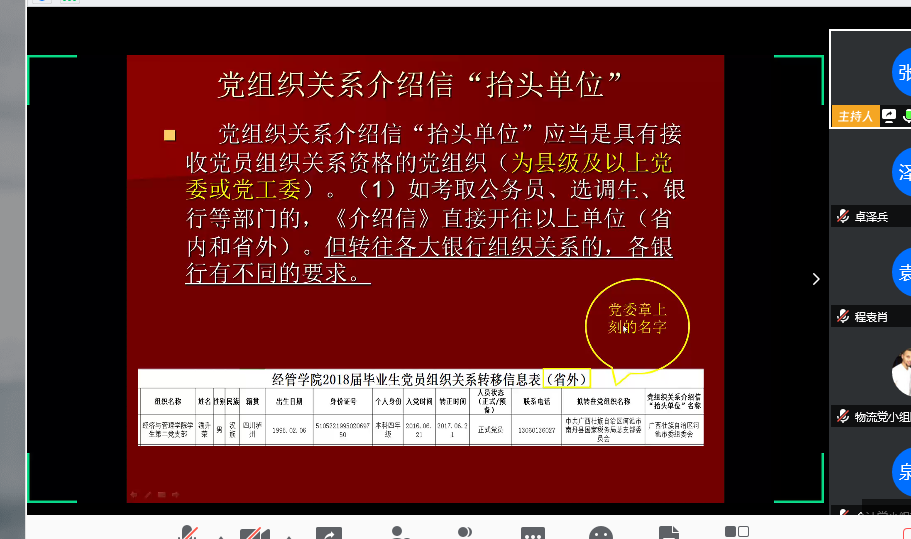 为规范党组织关系转移工作流程,帮助毕业生党员明确如何办理组织关系转移等程序,做好毕业生党员组织关系转接工作。2020年4月24日晚20:00,公司党委于腾讯会议在线平台召开2020届毕业生党员组织关系转接工作会议,会议由公司党委副书记朱艳主持,专职组织员张欣、员工党支部书记孙亚明和赵萍及70名毕业生党员参会。