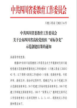 近日,省教育工委发布了《关于公布四川省高公司党组织“对标争先”示范创建结果的通知》,公司党委入选 “全省高公司党建工作标杆院系”培育创建单位。