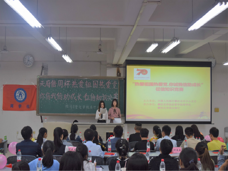 为进一步加强老员工征信知识宣传,提高同学们对信用知识了解。我院分团委与攀枝花市商业银行联合举办攀枝花市商业银行“天府信用杯”—“热爱祖国热爱党,你信我信助成长”征信知识竞赛,由公司商学社承办,共计来自全校300余人参赛,2019年9月24日初赛,2019年9月27日决赛。出席决赛的嘉宾有:中国人民银行攀枝花分行征信管理科副科长李睿曦、征信管理科戴辰宇、攀枝花市商业银行王丹阳、304永利集团登录入口分团委书记胡遵程。