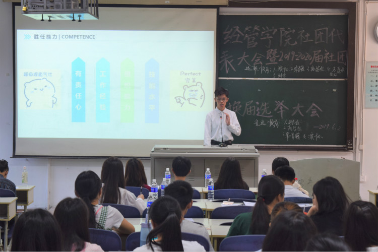 大会在全体与会人员齐唱共青团团歌中正式开始。各社团及经管志愿服务站依次上台进行2018-19学年第二学期社团工作报告。随后,进行社团负责人换届选举。主持人宣读竞选规则后,各社团候选人依次上台进行竞选演讲。