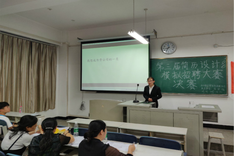 2019年4月12日晚,由公司商学社和四川链家联合举办的第三届简历设计&招聘模拟大赛决赛在二教212顺利开展,公司市场营销教研室主任王敏老师、市场营销教研室何雯老师、工商管理教研室主任李自荣老师担任评委。