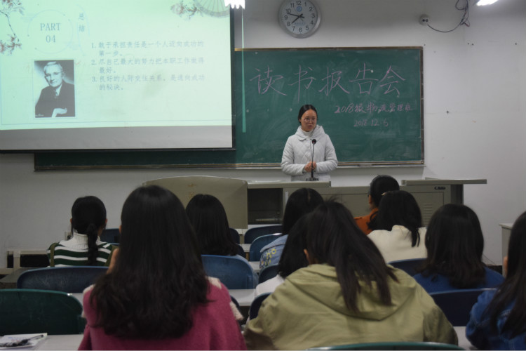2018年12月7日,公司分团委组织公司2018级各班级开展“经典阅读”—读书报告会。公司2018级市场营销专业老师何雯,2018级工商管理专业导师程高飞,2018级辅导员孙亚明参加各专业读书报告会。各班级同学采用PPT演讲方式,积极分享自己读书心得体会。