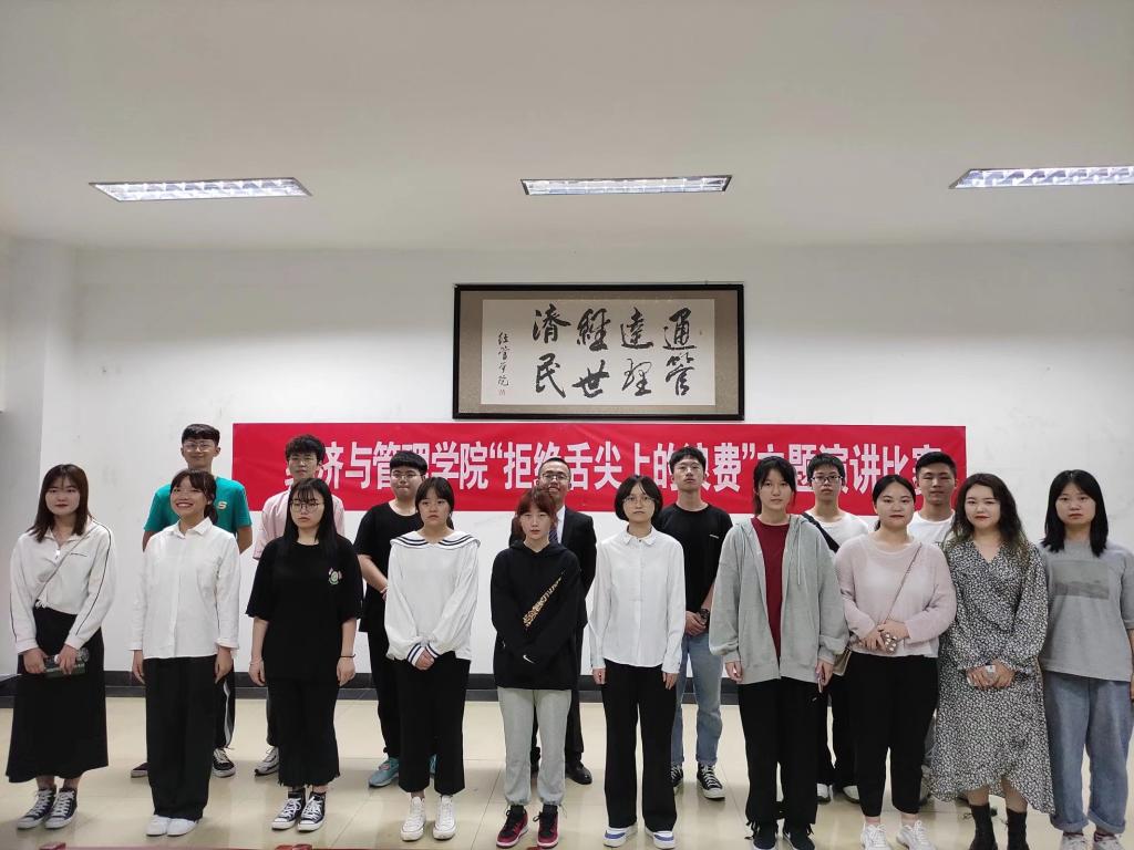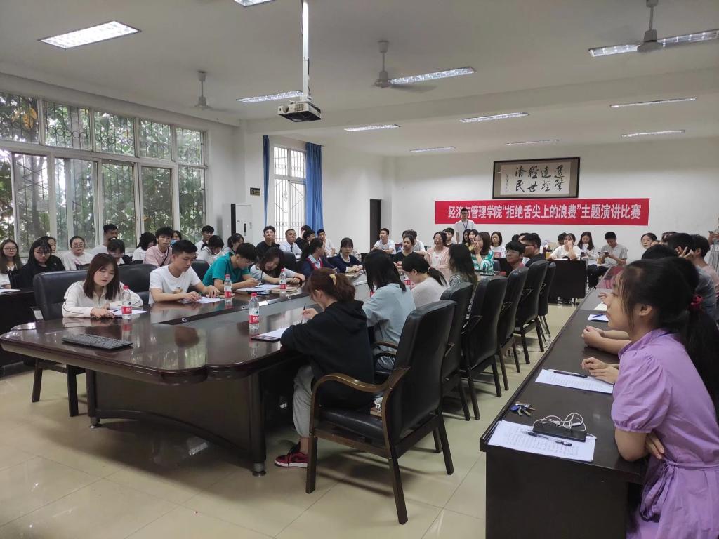 10月30日中午,304永利集团登录入口于明德楼二楼经管会议室举行“拒绝舌尖上的浪费”主题演讲比赛决赛。由我院团委员工会主席团成员担任评委,员工会各部门代表参与此次活动。