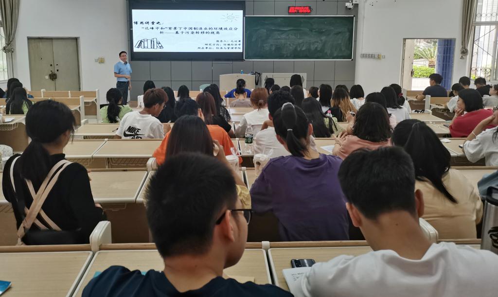 讲座中,毛运意讲述了全球环境问题的严重性,结合实际案例阐述了中国制造业的环境效应,并客观评价产业承接、经济发展与污染转移之间的关系。讲座过程中,通过生产责任制与消费责任制的互动讨论,倡导大家树立正确的生态观与消费观;通过“微笑曲线”案例分析揭示了制造业分工陷阱,借助“沉没成本”概念阐述了制造业转型困境与未来的可行路径。最后,他借用路遥《平凡的世界》中的经典语录作为结尾,鼓励大家珍惜时光,勤勉学习,不懈奋斗。
