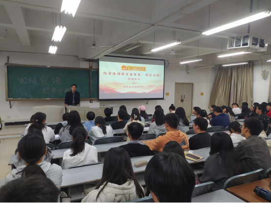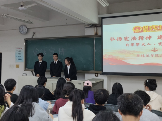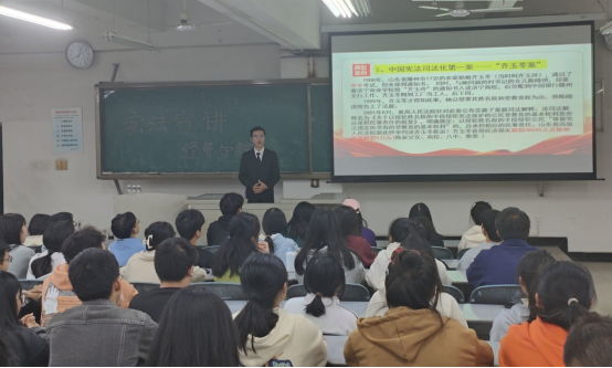 刘伟欣从我国第一部宪法《五四宪法》开始,并分别从宪法的含义、宪法的发展历程、宪法的主要内容、维护宪法的权威三个方面进行宣讲,让同学们对宪法有了较深入的认识,对宪法形成了一个较系统的整体概念。罗李杰、熊宇杭通过讲解多起真实典型案例,强调宪法对广大人民群众的保护作用的重要性,让同学们了解如何运用宪法维护自己的合法权益,同时告知同学们在网络上需谨言慎行,并提醒言论自由不等于自由言论。三位讲师团成员宣讲结束后,杨经理对讲师团成员的宣讲进行了总结,并向同学们传达了宪法至上守法光荣的守法理念。