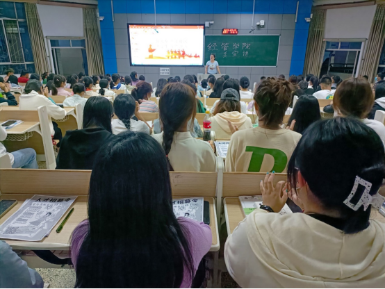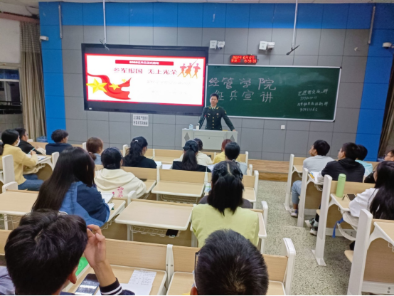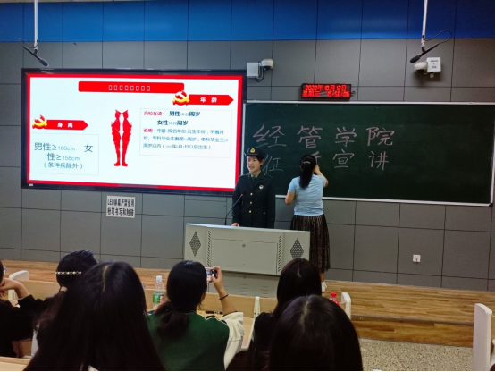 孙亚明向大家介绍宣讲团成员。李滢、白尚森从入伍的基本条件开始详细讲解,并介绍了报名参军的基本流程和入伍优惠政策,以及提干的相关事宜和直招军士条件。为使同学们更直观地体会到军营生活中的酸甜苦辣咸,欧阳为同学们播放了一段军营生活的视频。最后,李滢等人耐心的回答同学的各种问题,为同学们答疑解惑,积极与同学们互动,并鼓励大家积极参军。