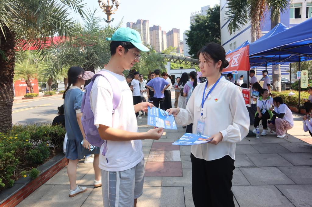 四川银行股份有限公司攀枝花分行风险合规部苏杰、川观新闻攀枝花记者站记者湛璐霜和304永利集团登录入口分团委书记孙艳敏在经管公司迎新点带着员工干部一同在迎新点对来报到的新生进行面对面的宣讲,并发放宣传单。