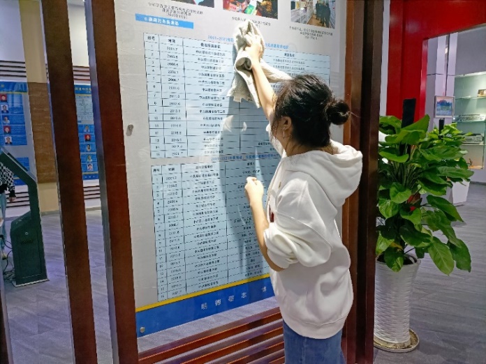 同学们分工明确,对校史馆的每一处都认真仔细地清扫。劳动过程中,他们不怕脏,不怕累,用心的擦拭着每一个展柜,检查每一处角落,经过同学们的辛苦付出,不懈努力,校史馆很快便被打扫得干净整洁。最后,同学们合影留念。