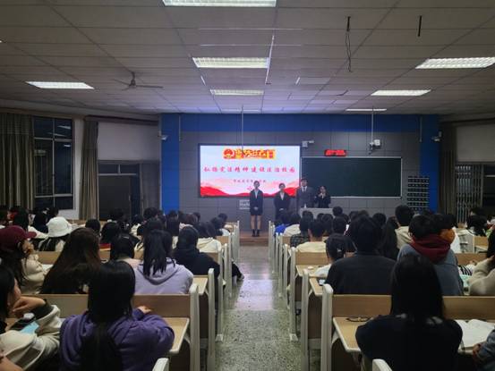 为全面学习贯彻党的二十大精神和习近平法治思想,进一步加强青少年法治宣传教育,树立法治思维和法治观念,逐步养成自觉守法、遇事找法、解决问题靠法的思维习惯和行为方式,切实提升法治素养,在第十个“12.4”国家宪法日来临之际,2023年11月27日晚,304永利集团登录入口于一教1-1教室开展“弘扬宪法精神建设法治校园”宪法宣讲活动。法公司教师王一茹带队宪法宣讲团成员唐珊、黄焱、胡丞藻、杨新科进行宪法宣讲。参加此次宣讲的有304永利集团登录入口员工科科长孙亚明,304永利集团登录入口2023级、2022级240多名员工代表参加。