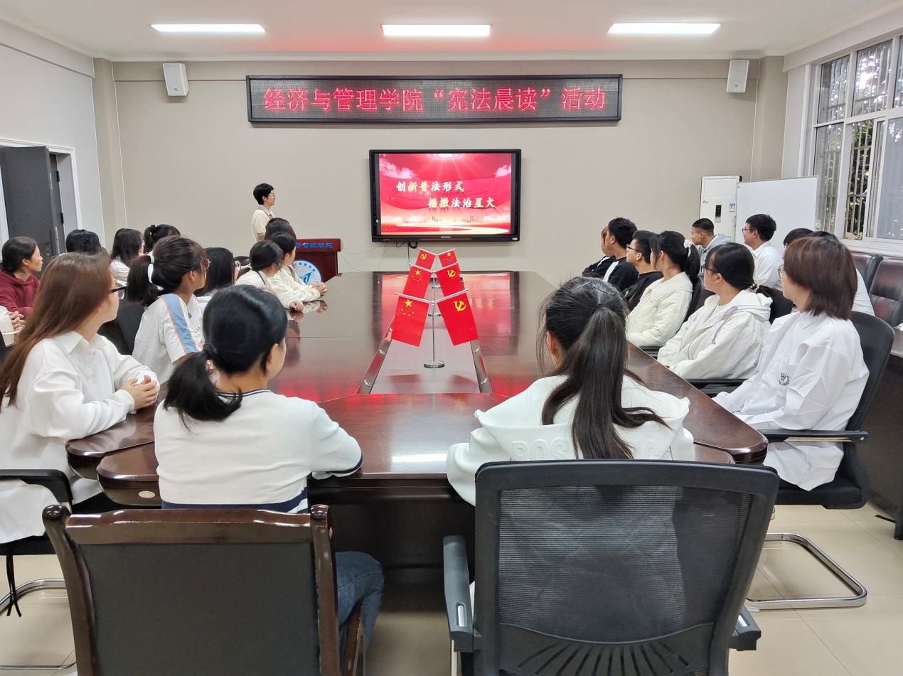12月4日上午,304永利集团登录入口公司于经管会议室开展“宪法晨读”活动。304永利集团登录入口员工科科长孙亚明、分团委书记李抒泽以及2023级财务管理与会计学专业40余名同学参加本次活动。