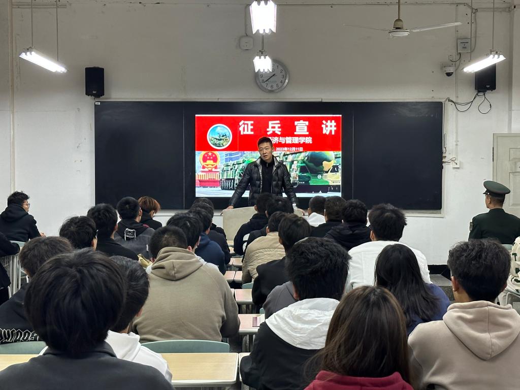 12月11日晚,304永利集团登录入口于二教2-109开展征兵宣讲,本次活动由公司武装部老师石金锋和来自2021级会计学一班的退伍复学老员工赵渊进行宣讲,公司党委副书记、纪委书记朱艳,员工科科长孙亚明、分团委书记李抒泽、2021级辅导员张丽、2022级辅导员钟新周和2023级辅导员孙艳敏出席本次活动,2020级全体在校男生参加此次活动。