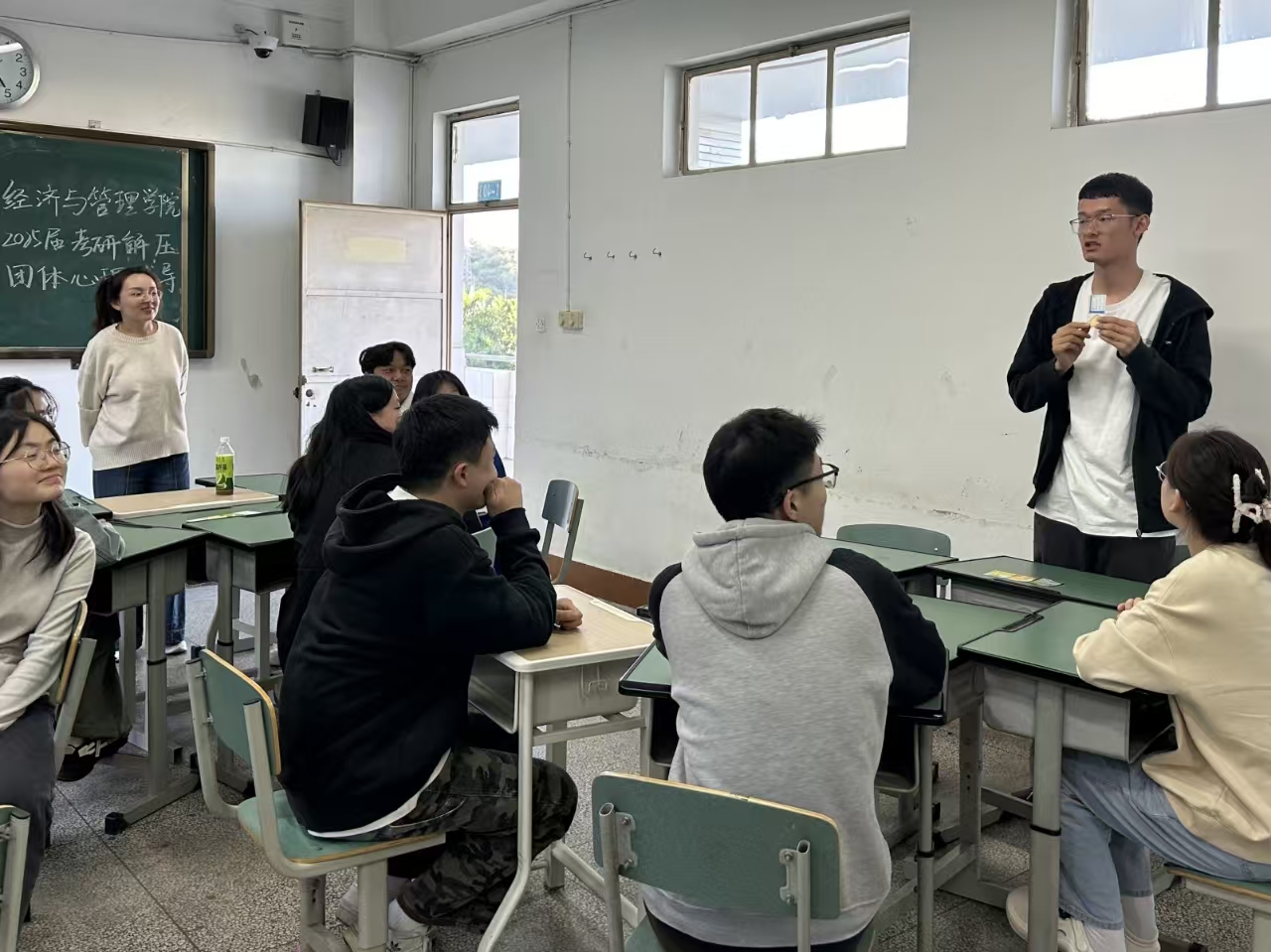 为缓解考研同学的心理压力,11月13日下午,特邀2023级辅导员、心理中心兼职老师倪萍在一教1-403开展减压团体活动,公司党委副书记、纪委书记朱艳,2021级辅导员孙艳敏出席本次活动,2021级考研同学参与其中。