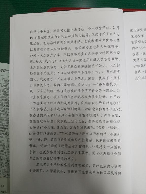 一名党员就是一面旗帜,哪里有疫情,哪里就有他们的身影。作为一名入党积极分子同时也是一名新时代老员工,也应该从自身做起,以实际行动践行听党话、跟党走的初心使命!所以回到攀枝花以后,我积极进行自我隔离。在听说公司要组织抗疫志愿者,可以为抗击疫情贡献自己一份力量时,我毫不犹豫的交上了自己的志愿者申请表。也有很多家里人对于我做志愿者非常不理解,他们觉得现在疫情这么严重还出去当志愿者,干这种费力不讨好的事情最后还可能把病毒带回来。面对家人的不理解,我耐心的给他们做了很多思想工作。因为在社区当志愿者每天要接触形形色色的人,出于安全考虑,我从家里搬出来自己一个人租房子住。219日我在攀枝花市东区西海岸社区报到,正式开始了自己志愿工作。西海岸社区因为有菜市场、医院和很多单位办公楼以及商铺所以人口流动量大,各式老楼里老年人居住较多,外来人员及租户密集,所以需要更多的人手帮助社区抗击疫情。每天,我都与社区工作人员一起完成返攀人员信息登记、录入社区居民信息、向社区群众宣传疫情防护知识、以及协助社区居民完成出入证与健康证明办理等工作。在当志愿者期间,我处理了上万条返攀人员信息;统计、核实了上万条社区居民信息。虽然不能像那些医护人员一样奋斗在抗疫一线,但自己做的工作也是抗疫环节中不可缺少的一部分。对于上级布置每一项工作和任务我都尽全力将它做好。自己的工作也得到了社区和街道的认可。在奉献自己的同时也收获了许多感动,最让我印象深刻的是一对年逾古稀的爷爷奶奶,在办理健康证明时因为不会操作智能手机遇到了许多困难,在热情地帮助他们完成线上登记之后,老奶奶激动地握住我的手说:“小姑娘,谢谢你,回头到我家来玩。”我说:“奶奶,这是我们应该做的。”可老奶奶依旧没有放开我的手,不住地说:“好,好,那你以后到成都给我打电话,我邀请你来我家做客。”说着还询问了我的生活工作情况,让我感觉十分温暖亲切,也更加感觉到自己工作的重要性,同时也深刻体会到自己做志愿者这件事情的意义。