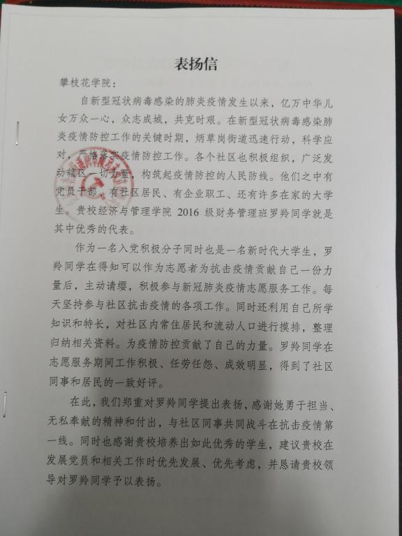 在此,我们郑重对罗羚同学提出表扬,感谢她勇于担当、无私奉献的精神和付出,与社区同事共同战斗在抗击疫情第一线。同时也感谢贵校培养出如此优秀的员工,建议贵校在发展党员和相关工作时优先发展、优先考虑,并恳请贵校领导对罗羚同学予以表扬。
