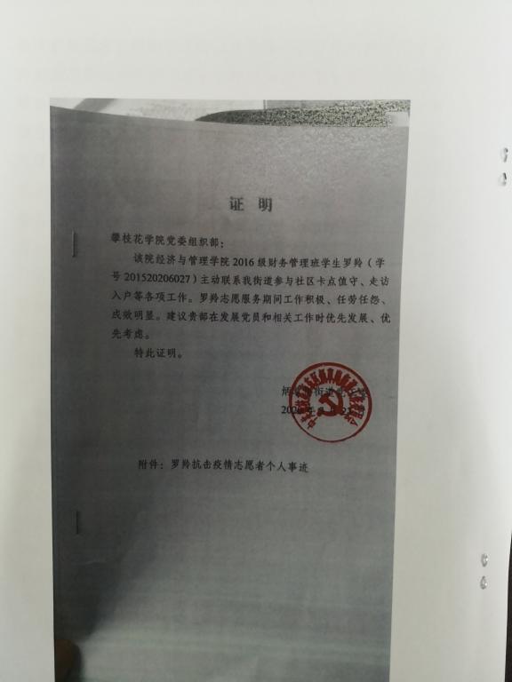 作为一名入党积极分子同时也是一名新时代老员工,罗羚同学在得知可以作为志愿者为抗击疫情贡献自己一份力量后,主动请缨,积极参与新冠肺炎疫情志愿服务工作。每天坚持参与社区抗击疫情的各项工作。同时还利用自己所学知识和特长,对社区内常住居民和流动人口进行摸排,整理归纳相关资料。为疫情防控贡献了自己的力量。罗羚同学在志愿服务期间工作积极、任劳任怨、成效明显,得到了社区同事和居民的一致好评。