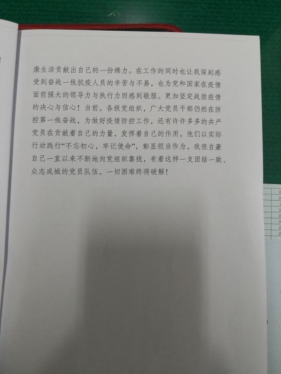 志愿者的生活让我感觉到非常充实,同时也从内心觉得十分满足。在紧要关头,我很高兴也很荣幸为社区居民的健康生活贡献出自己的一份绵力。在工作的同时也让我深刻感受到奋战一线抗疫人员的辛苦与不易,也为党和国家在疫情面前强大的领导力与执行力而感到敬服。更加坚定战胜疫情的决心与信心!当前,各级党组织,广大党员干部仍然在防控第一线奋战,为做好疫情防控工作,还有许许多多的共产党员在贡献着自己的力量,发挥着自己的作用,他们以实际行动践行“不忘初心、牢记使命”,彰显担当作为,我很自豪自己一直以来不断地向党组织靠拢,有着这样一支团结一致、众志成城的党员队伍,一切困难终将被克服!