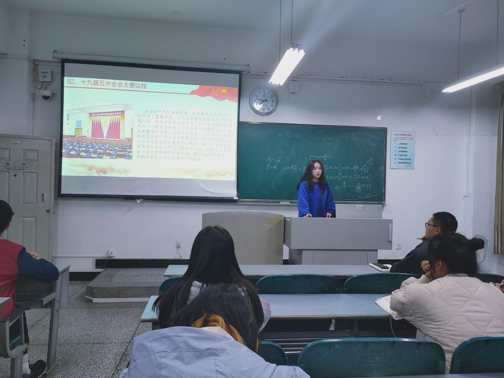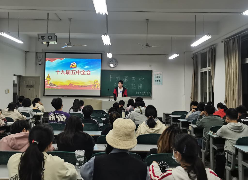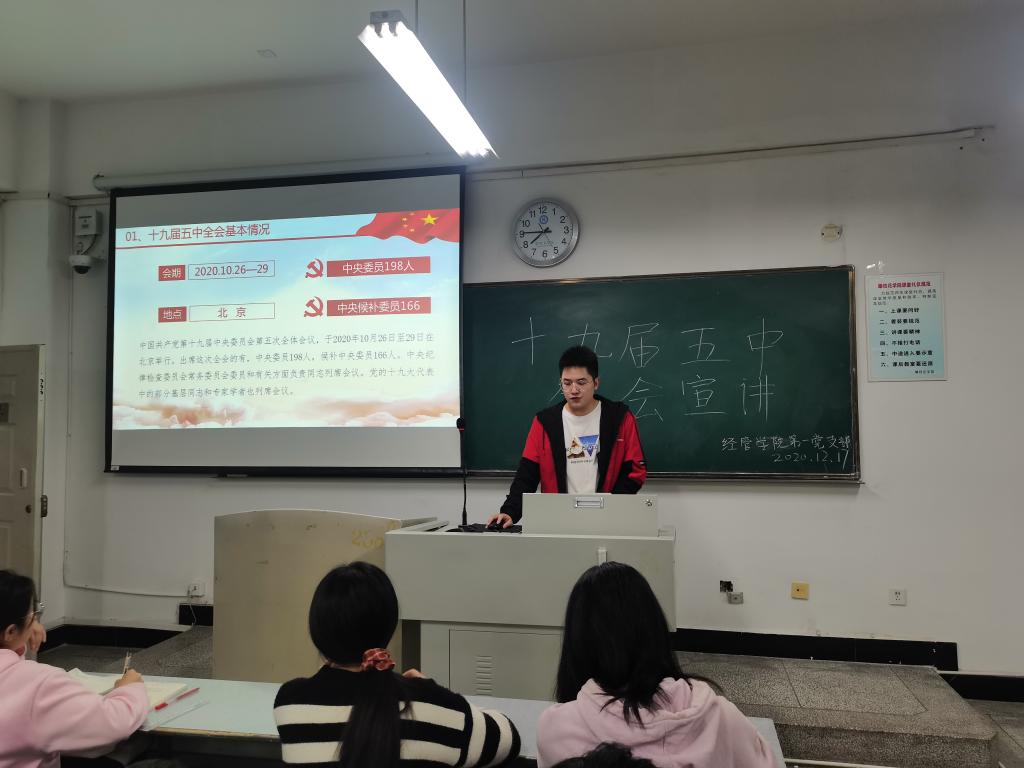 12月17日晚,公司第一党支部成员分别到2-408、410教室向2020级财务管理专业和会计学专业同学宣讲党的十九届五中全会内容。