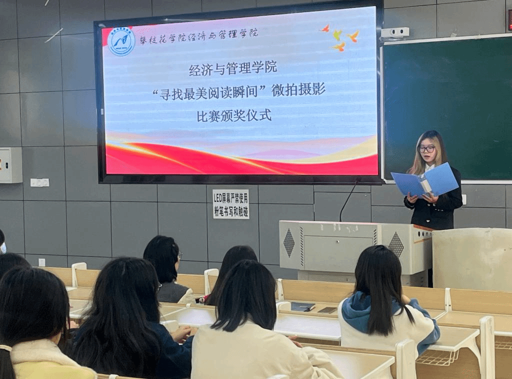 颁奖仪式开始,主持人胡秦依次展示获奖作品,这些照片定格下了同学们认真阅读和学习的瞬间。紧接着,获奖同学依次上台领奖,李抒泽、郝智勤为同学们颁发奖状和奖品。随后,李抒泽对同学们的微拍作品表示了肯定,并鼓励同学们通过阅读书籍不断提升自我修养,培养阅读习惯。最后,大家合影留念。