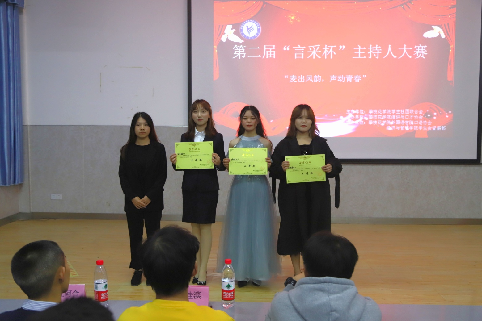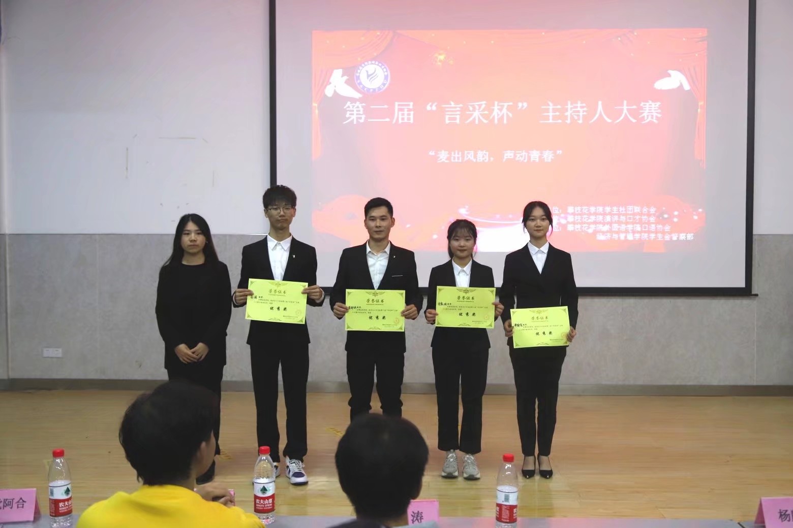 在经过初赛与复赛的激烈比拼后,共有10位选手挺进决赛。比赛上半场,10位选手依次上台主持比赛,展现出各自不俗的语言表达能力。在经过评委评分及嘉宾投票后,比赛进入下半场,由10位选手组成5队,搭档主持,选手们配合默契,充分展示其超强的主持水平。最后,唐彩虹对参赛选手的表现进行点评,同时对他们的精彩表演予以肯定。在经过激动人心的抽奖环节后,第二届“言采杯”主持人大赛决赛最终获奖名单如下: