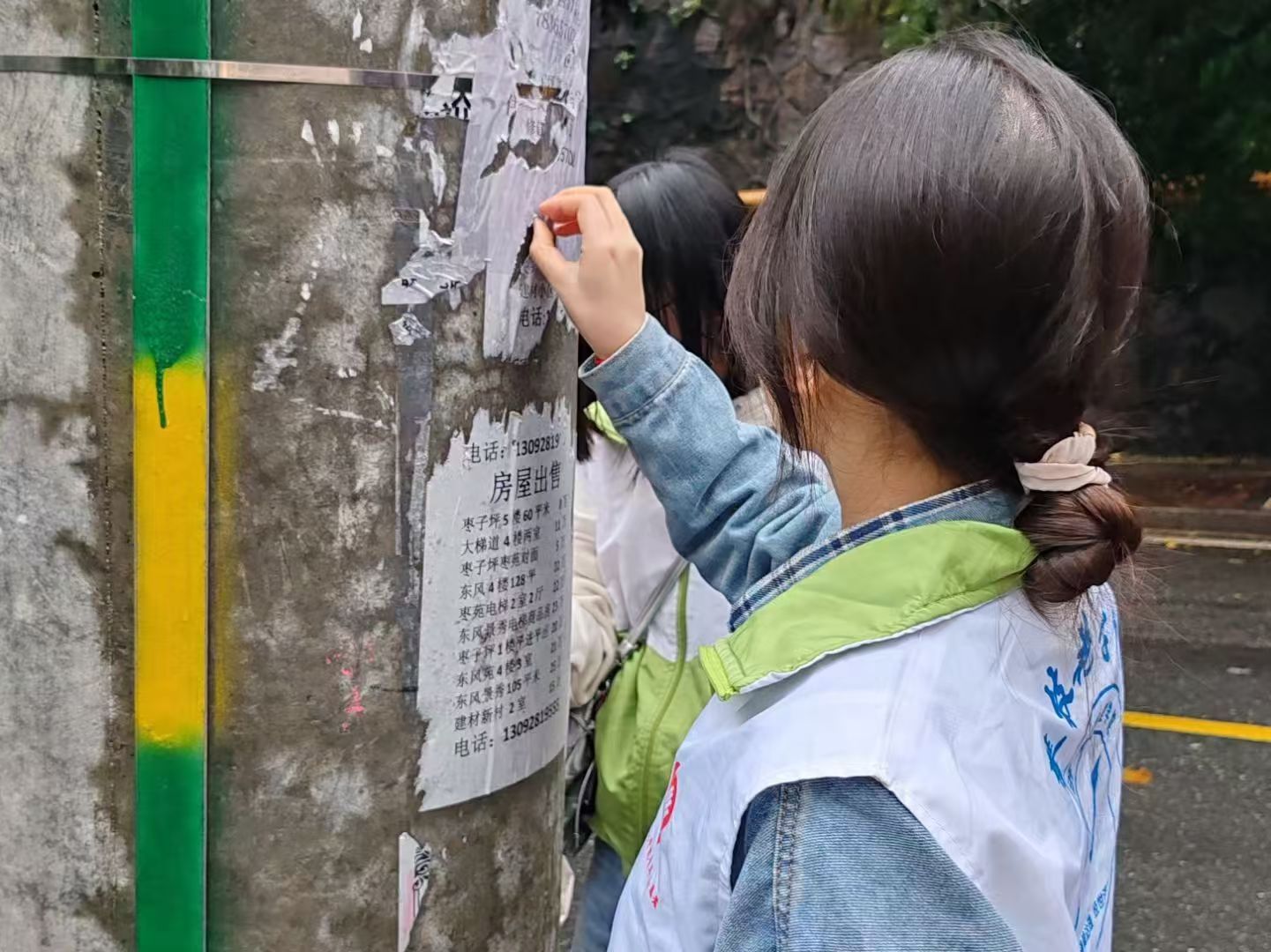 活动过程中,志愿者们在社区工作人员的带领下到不同地方进行走访,排查安全隐患并对居民的居住环境进行考察,记录并反馈其中潜在的安全问题。随后,他们对社区街道的白色广告进行清理,美化社区环境,还张贴施工警示标语提醒居民。最后,志愿者们在社区门前合影留念。
