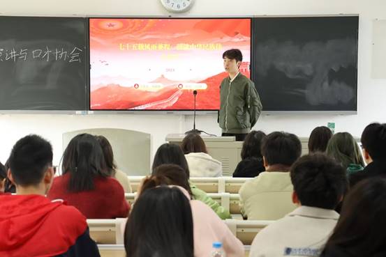 1215日中午,演讲与口才协会于一教1-415开展以七十五载风雨兼程,铸就中华民族伟大复兴为主题的思政活动。演讲与口才协会干事邓巧玲和刘诺阳作为本次活动主讲人,演讲与口才协会全体成员参加。