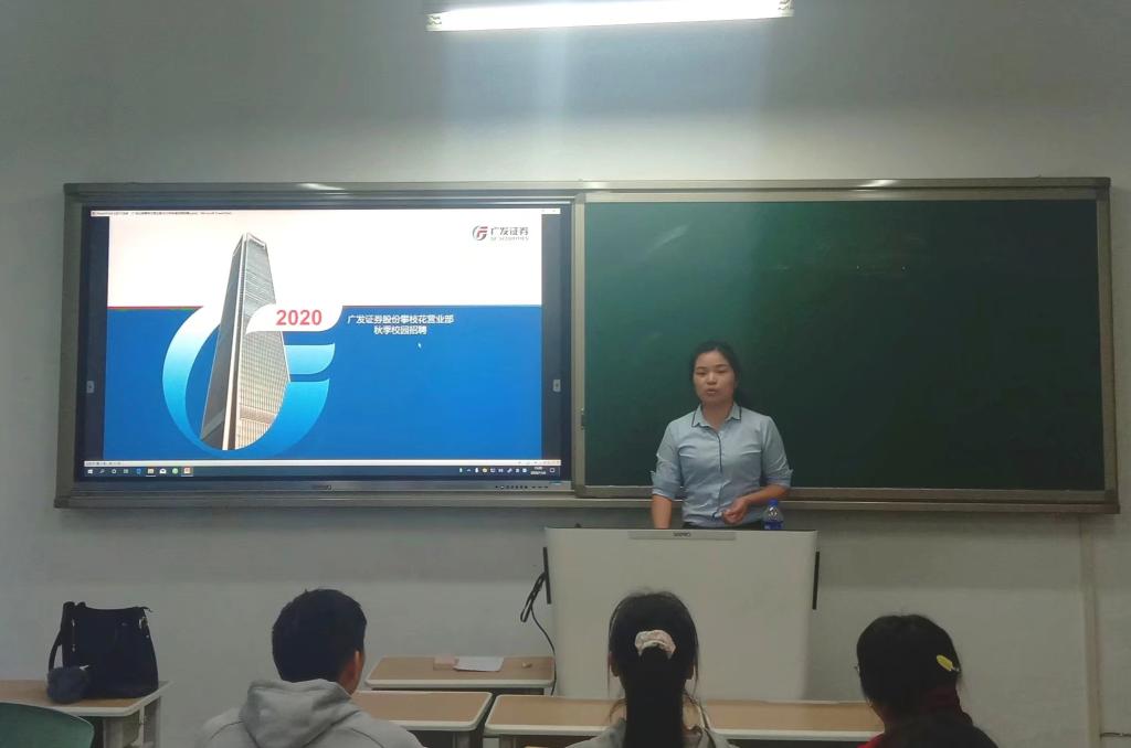 11月6日下午,304永利集团登录入口于一教106开展广发证券股份攀枝花营业部秋季招聘会,出席本次会议的有广发证券股份攀枝花营业部总监黄小月、客户经理颜榛及HR李倩,公司2017-2018级部分同学参与此次招聘会。