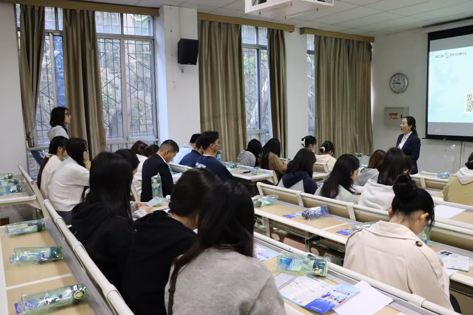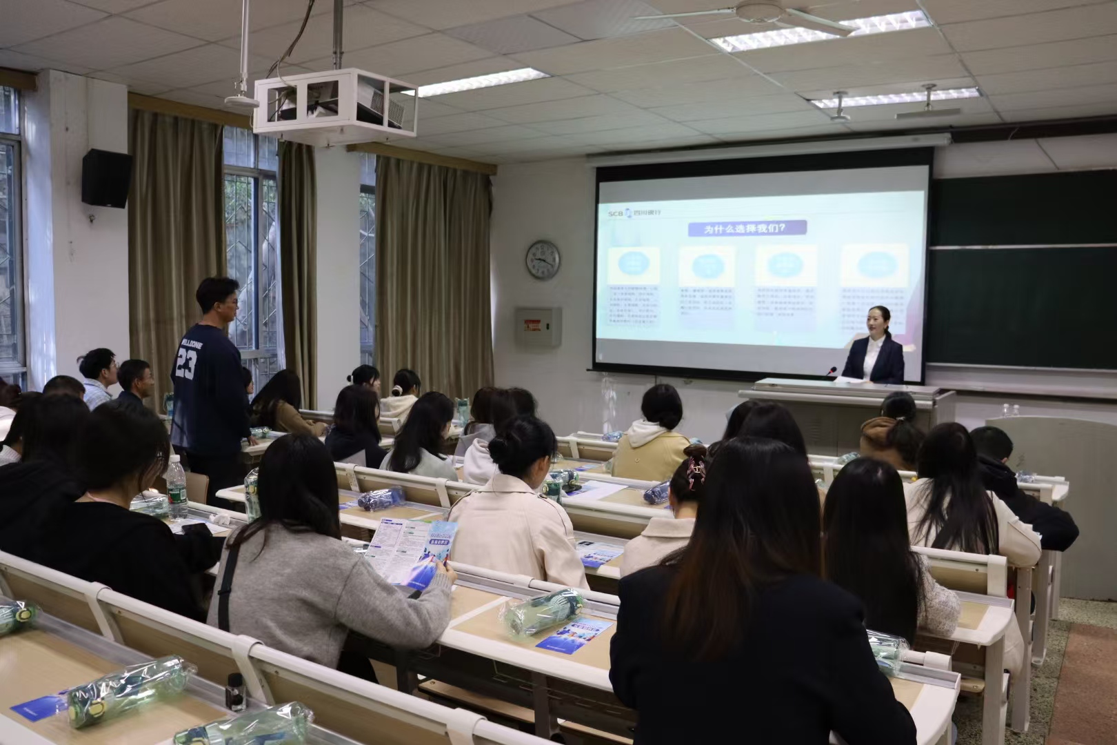 宣讲伊始,杨佳介绍了四川银行的发展进程、组织架构体系和工作环境,并重点讲解了公司所具备的优势。同时,针对大家关心的薪酬福利、晋升渠道等问题,杨佳一一讲解。在互动环节,同学们积极提问,工作人员耐心解答,现场氛围活跃。