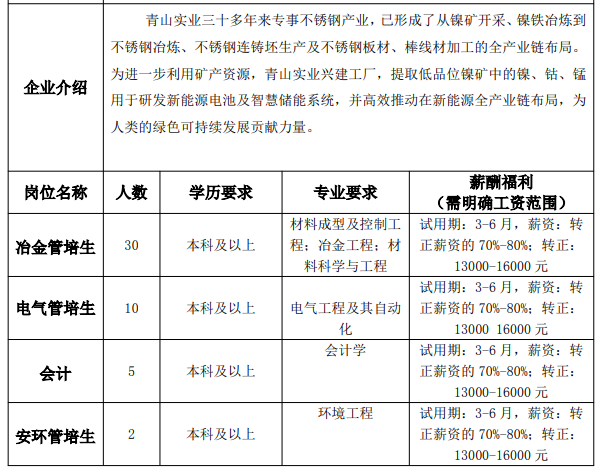 2024年10月9日(星期三)上午9:00在2-216青山控股集团有限公司进行专场招聘会,招聘专业涉及电气自动化、会计、环境工程、材料成型及、冶金工程、材料科学与工程等专业。