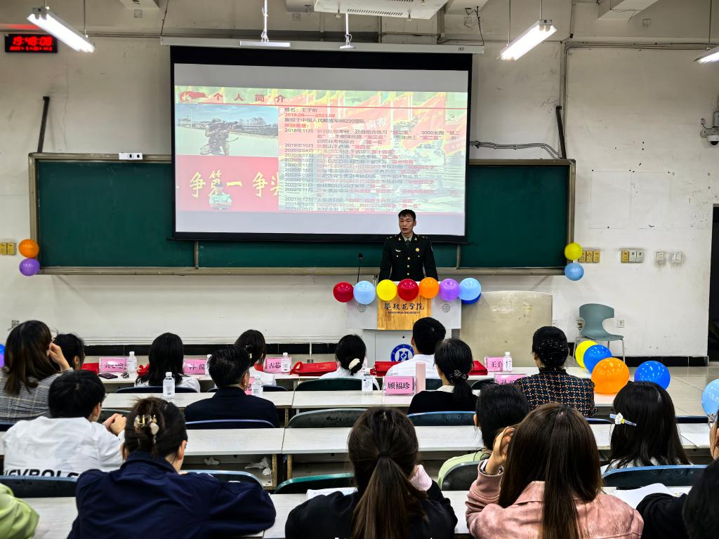 活动伊始,王子珩先进行个人介绍,分享自己的军旅生涯。接着,他从参军基本条件、报名参军的基本流程、参军入伍的优惠政策、军考与提干等方面进行宣讲。最后王子珩鼓励大家在军营中绽放青春光彩,实现人生价值。