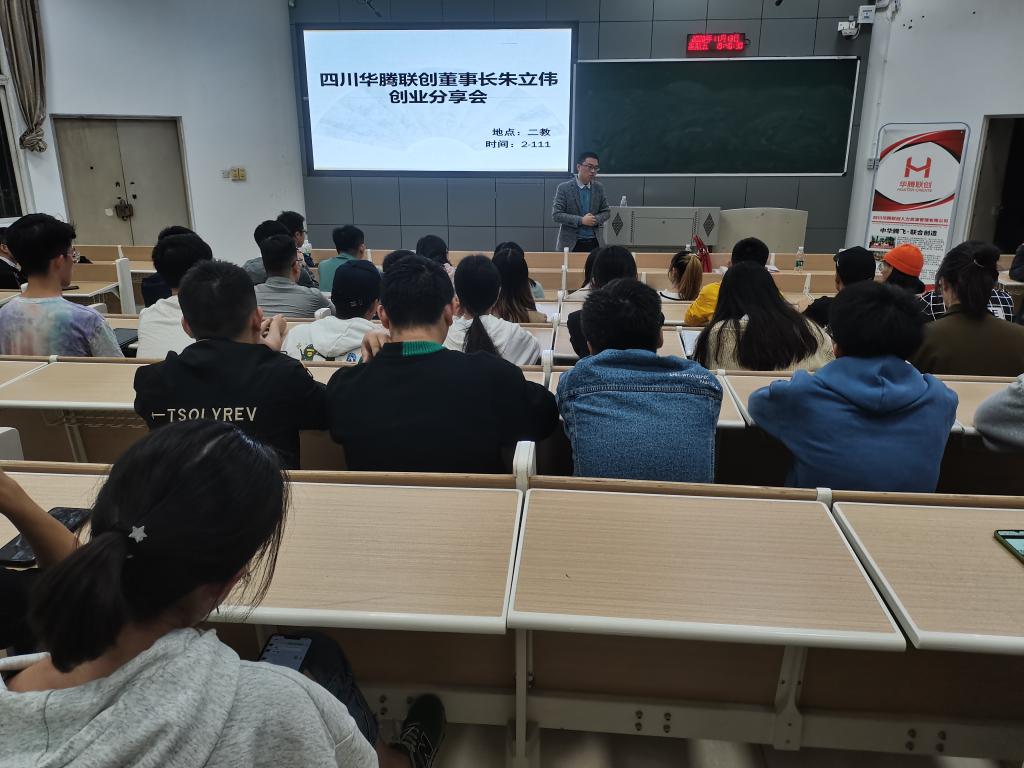11月13日晚,304永利集团登录入口在二教2-111举行四川华腾联创人力资源管理有限公司董事长朱立伟创业分享会,主讲人为四川华腾联创董事长朱立伟,到场的还有公司总经理李伟,公司运营经理石江、兰武,据悉4位均是公司2014届工商管理优秀员工,公司财务总监刘建霞系公司2010届财务管理班优秀员工。公司员工科胡遵程老师,2017级70余人参加。
