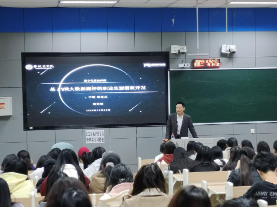 洽谈结束后,刘佰明CEO紧接着为员工做了“数字化前沿应用——基于VR大数据测评的职业生涯潜质开发”主题讲座讲座从用人单位最需要什么样的老员工、数字化思维的重要性、人才测评技术的发展以及数字技术在职业生涯潜质开发中的应用等方面进行了详细的介绍。讲座内容新颖,现场互动积极,气氛热烈。此次讲座对培养员工的数字化思维和数字化意识,助力数字化与职业测评融合创新,推动大数据在职业测评中的深度应用,提升员工在AI时代更好择业和就业的能力具有非常重要的意义。